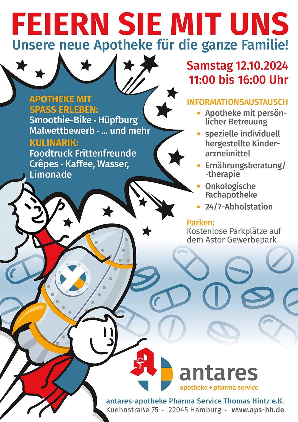 Am Samstag, 12. Oktober 2024, möchten wir mit den Stadtteilen Jenfeld und Tonndorf die neue Eröffnung unserer Apotheke an der Kuehnstraße 75 feiern. Es gibt ein richtig buntes Programm für die ganze Familie. Wir freuen uns auf den Besuch.